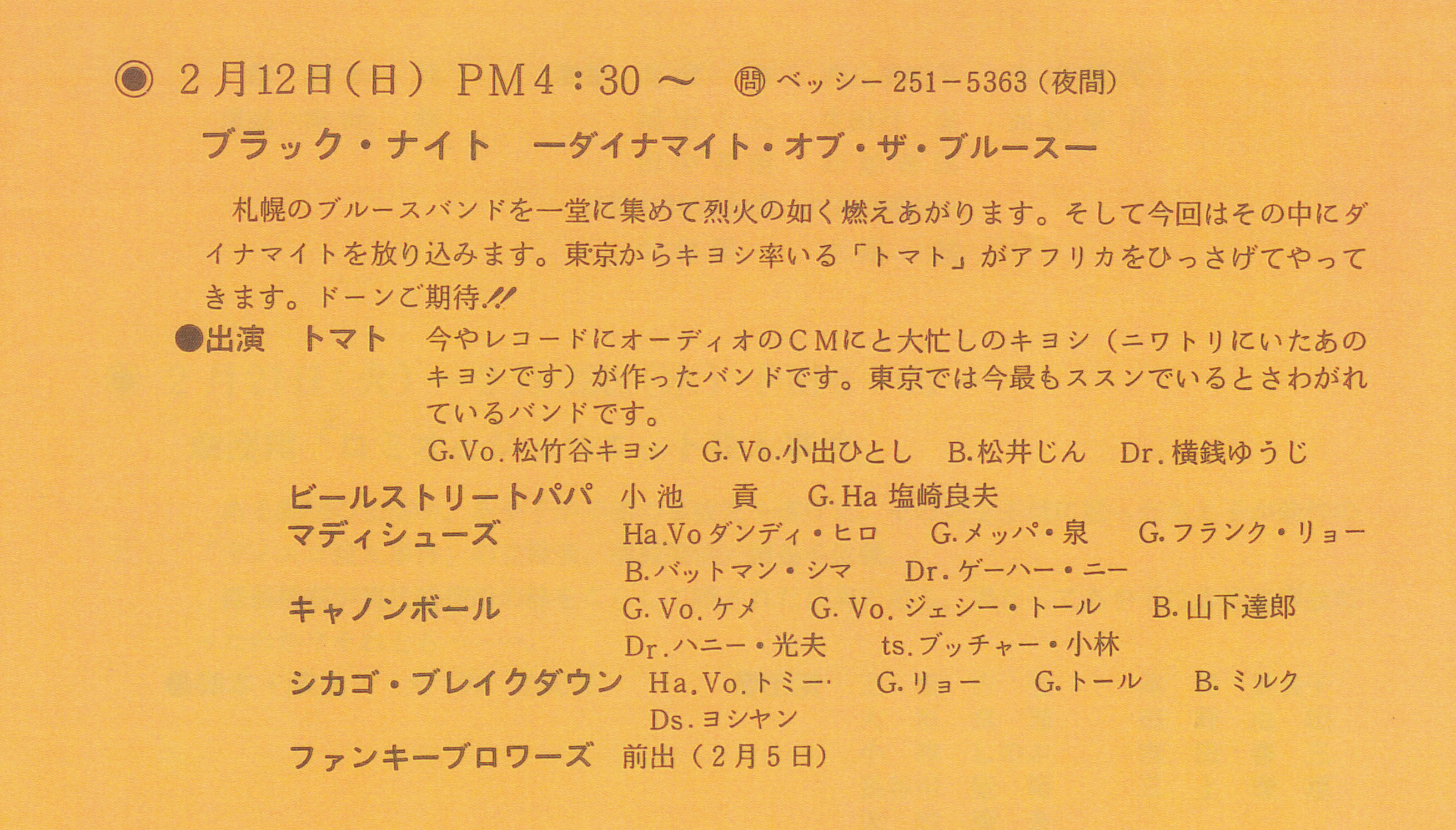 出演 トマト(松竹谷キヨシ,小出ひとし,松井じん,横銭ゆうじ),ビールストリートパパ,マディシューズ,