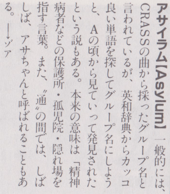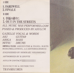 ALL MUSIC WAS PERFORMED,COMPOSED &PRODUCED BY ASYLUM GAZELLE VOCAL & WORDS AKI GUITAR ARIGA BASS MITSU DRUMS ADDITIONAL PLAYERS KEI(SYNTHE & PIANO) M.KITAMURA(MELLOTRON) A.U.SISTERS(CHORUS) ENGINEERED BY HIDEKAZU NEGISHI(DIG) ARTWORKED BY K-CRYPTE