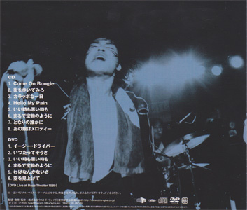 ■CD 1.Come On Boogie 2.街を歩いてみろ 3.カラッポな一日 4.Hello My Pain 5.いい時も悪い時も 6.まるで宝物のように 7.となりの誰かに 8.あの娘はメロディー ■DVD Live at Baus Theater 1989 1.イージー・ドライバー 2.いつだってそうさ 3.いい時も悪い時も 4.まるで宝物のように 5.わけなんかないさ 6.空を見上げて |