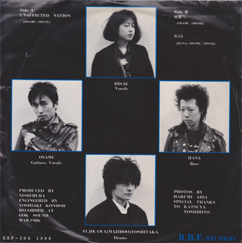 PRODUCED BY NISHIMURA ENGINEERED BY YOSHIAKI KONDOH RECORDED AT GOK SOUND MAR.1986 PHOTOS BY HARUMI AIDA SPECIAL THANKS TO KATSUYA YOSHIHITO HISAE;Vocals HANA;Bass FUJIKAWA(MAZIBOO)YOSHITAKA;Drums OSAMU;Guitar,Voacls