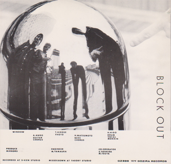 A.ANDO-GUITAR,CHORUS T.HIROSE-FHOTO H.MATSUMOTO-BASS,CHORUS H.HIGO-DRUM,VOCAL,MOKKIN PRODUCE MIRRORS ENGINEER M.YAMAURA CO-OPERATOR S.YOSHIDA M.TSUYA RECORDED AT S-KEN STUDIO MIXED DOWN AT THEORY STUDIO MFD.ATHENE RECORDS IND.CO.LTD.(AOS-39)