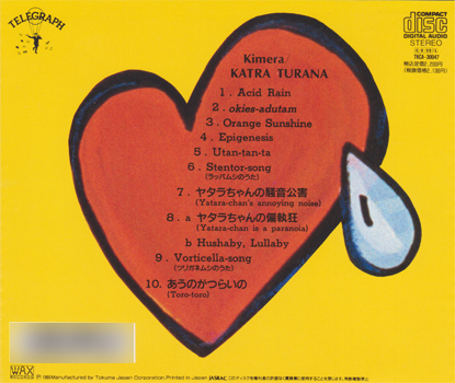 1.Acid Rain 2.okies-adutam 3.Orange Sunshine 4.Epigenesis 5.Utan-tan-ta 6.Stentor-song(ラッパムシのうた) 7.ヤタラちゃんの騒音公害 8.a ヤタラちゃんの偏執狂 b Hushaby,Lullaby 9.Vorticella-song(ツリガネムシのうた) 10.あうのがつらいの(Toro-toro) | |