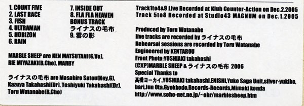MARBLE SHEEP are KEN MATSUTANI (G,Vo) RIE MIYAZAKI (B,Cho) MARBY ライナスの毛布 are Masahiro Satou (Key,G) Kazuya Takahashi (Dr) Toshiyuki Takahashi (Dr) Toru Watanabe (B,Cho) Produced by Toru Watanabe live tracks are recorded by ライナスの毛布 Rehearsal sessions are recorded by Toru Watanabe Engineered by KENTAROU Front Photo:YOSHIAKI takahashi (C)(P)MARBLE SHEEP & ライナスの毛布 2006 Special Thanks to 高橋ヨーカイ,YOSHIAKI takahashi,えにし,Yuko Saga Unit,Silver-yukiko, bari,jun ota,Gyokkodo,Records-Records,Mimaki konda |