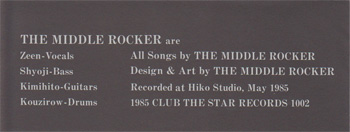 All Songs by THE MIDDLE ROCKER Design & Art by THE MIDDLE ROCKER Recorded at Hiko Studio,May 1985 1985 CLUB THE STAR RECORDS 1002