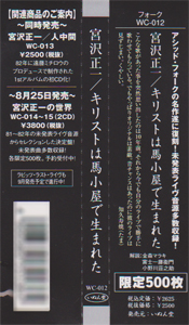 all songs written by 宮沢正一 vocal&guitar 宮沢正一 reissue stuff:producer 天野敬大&いぬん堂 A&R 牛戸圭一(いぬん堂) mastering engineer 柴 晃浩(JVC MASTERING CENTER) GRAPHIC DESINGER 松本成夫(MATSUMOTO GRAPHIC FARM) special thanks:知久寿焼 金森マラキ 富士一藤衛門 小野川荘之助 遠藤ミチロウ 伊東哲男
