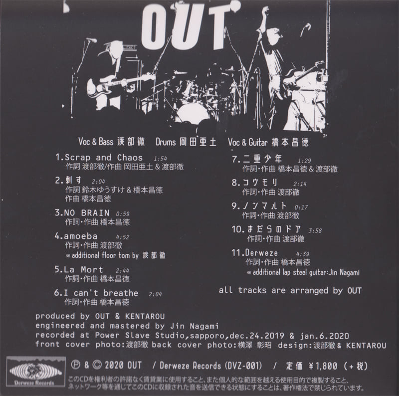 1.Scrap and Chaos 作詞 渡部徹/作曲 岡田亜土 & 渡部徹 2.刺す 作詞 鈴木ゆうすけ & 橋本昌徳 作曲 橋本昌徳 3.NO BRAIN 作詞・作曲 橋本昌徳 4.amoeba 作詞・作曲 渡部徹 ※additional floor tom by 渡部徹 5.La Mort 作詞・作曲 橋本昌徳 6.I can't breathe 作詞・作曲 橋本昌徳 7.二重少年 作詞・作曲 橋本昌徳 & 渡部徹 8.コウモリ 作詞・作曲 渡部徹 9.ノンマルト 作詞・作曲 渡部徹 10.まだらのドア 作詞・作曲 渡部徹 11.Derweze 作詞・作曲 橋本昌徳 ※additional lap steel guitar:Jin Nagami |