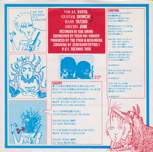 VOCAL RYOTA GUITAR SHINICHI BASS TATSUO DRUMS JUNE RECORDED AT GOK SOUND ENGINEERED BY YOSHIAKI KONDOH PRODUCED BY THE POGO & NISHIMURA COVERING BY ZERO(KANATH POOL) R.B.F.RECORDS 1986