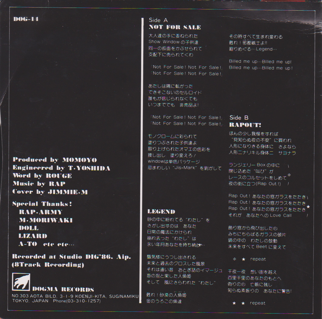 Produced by MOMOYO Engineered by T.YOSHIDA Word by ROUGE Muusic by RAP Cover by JIMMIE.M Special Thanks! RAP ARMY M.MORIWAKI DOLL LIZARD A-TO etc etc... Recorded at Studio DIG'86.Aip. (8Track Recording)