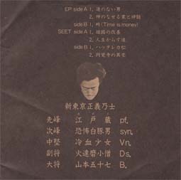 先鋒 江戸蔵(エディ) pf. 次鋒 恐怖白豚男 syn. 中堅 冷血少女 Vn. 副将 火達磨小僧 Ds. 大将 山本五十七 B. ゲスト(ソノシート) いぬ子(写真) 順ちゃん 調律師 ケラ 編曲/新東京正義乃士 佐々木貴(Syn.アレンジ) 録音/熱心スタジオ 技師/tabo プロデュース/ケラ 制作/ナゴムレコード |